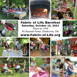 BARNFEST is a FREE community event starting at 1PM on Saturday, October 14th on Bassett Road in Shelburne. The whole family will enjoy live demonstrations in glass blowing, sheep shearing, processing flax to linen, broom making, logging with oxen, and sawing on a portable sawmill. Bring your hand tools for sharpening, weave a cattail doll, create an apron from your favorite t-shirt, create an upcycled instrument, try a ukulele or fiddle, hone your fiddle skills, or build a Hugelkulture bed. Weave on a loom, take a free horse drawn wagon ride, join us for a parade led by a local brass band, enter a raffle, enjoy a community supper, and stay for live after-dinner music and contra dancing! Please leave pets at home. www.fabric-of-life.org