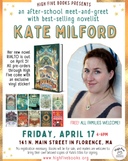 Come meet bestselling novelist Kate Milford! The author of the GREENGLASS HOUSE series will be in the High Five Books studio after school from 4-6pm on Friday, April 17 to celebrate the launch of her new magical mystery book, RIALTO. Please join us for a free meet-and-greet with Kate, who will answer Qs about writing and inventing new worlds.